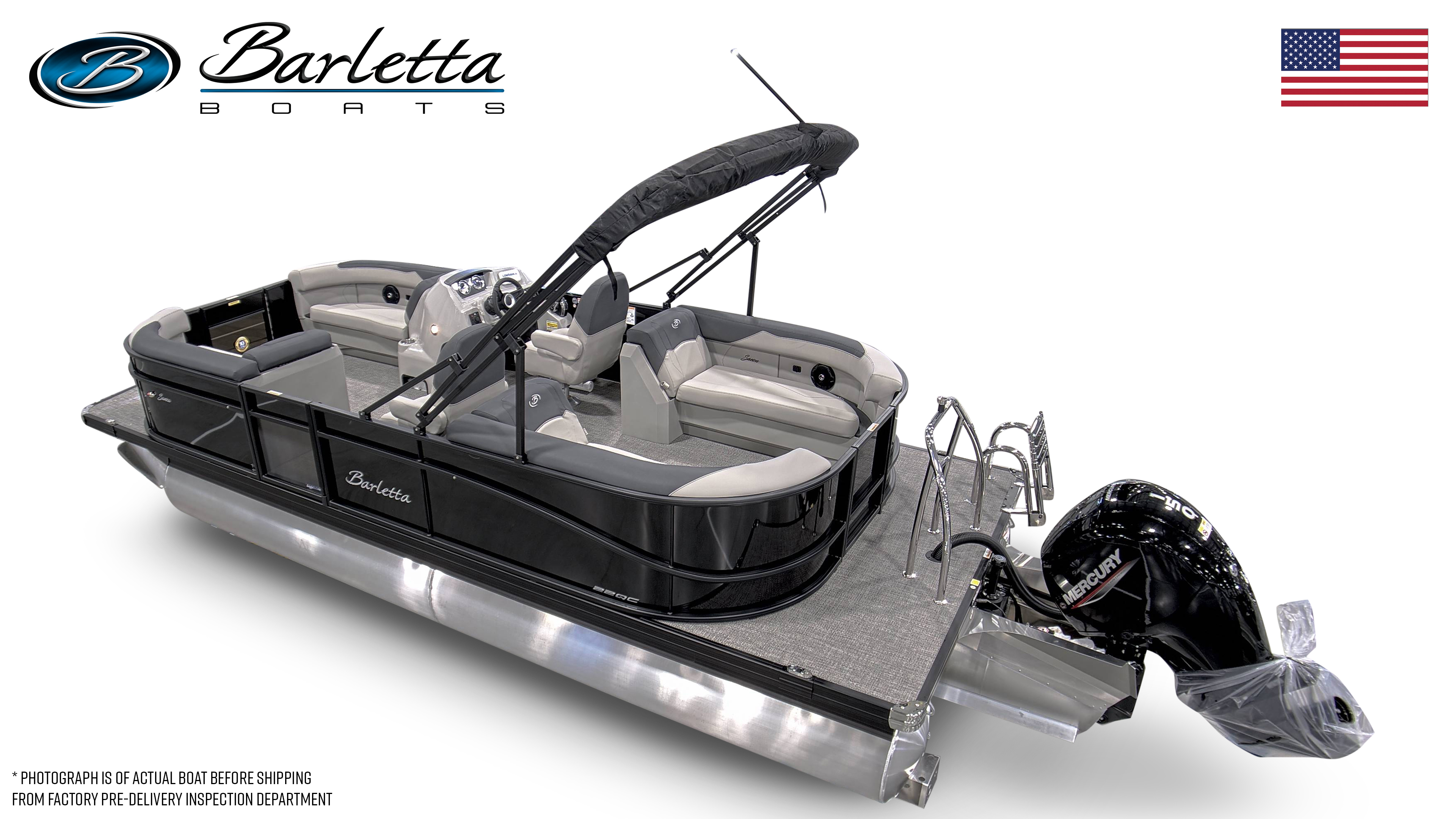 The all new affordable luxury tritoon from Bartlett, the Sanza S22QC with Mercury 150hp, ski tow bar, stainless steel ladder,tritoon package, in floor storage, black diamond panel, blackout package, amore grey flooring, grey and onyx interior,